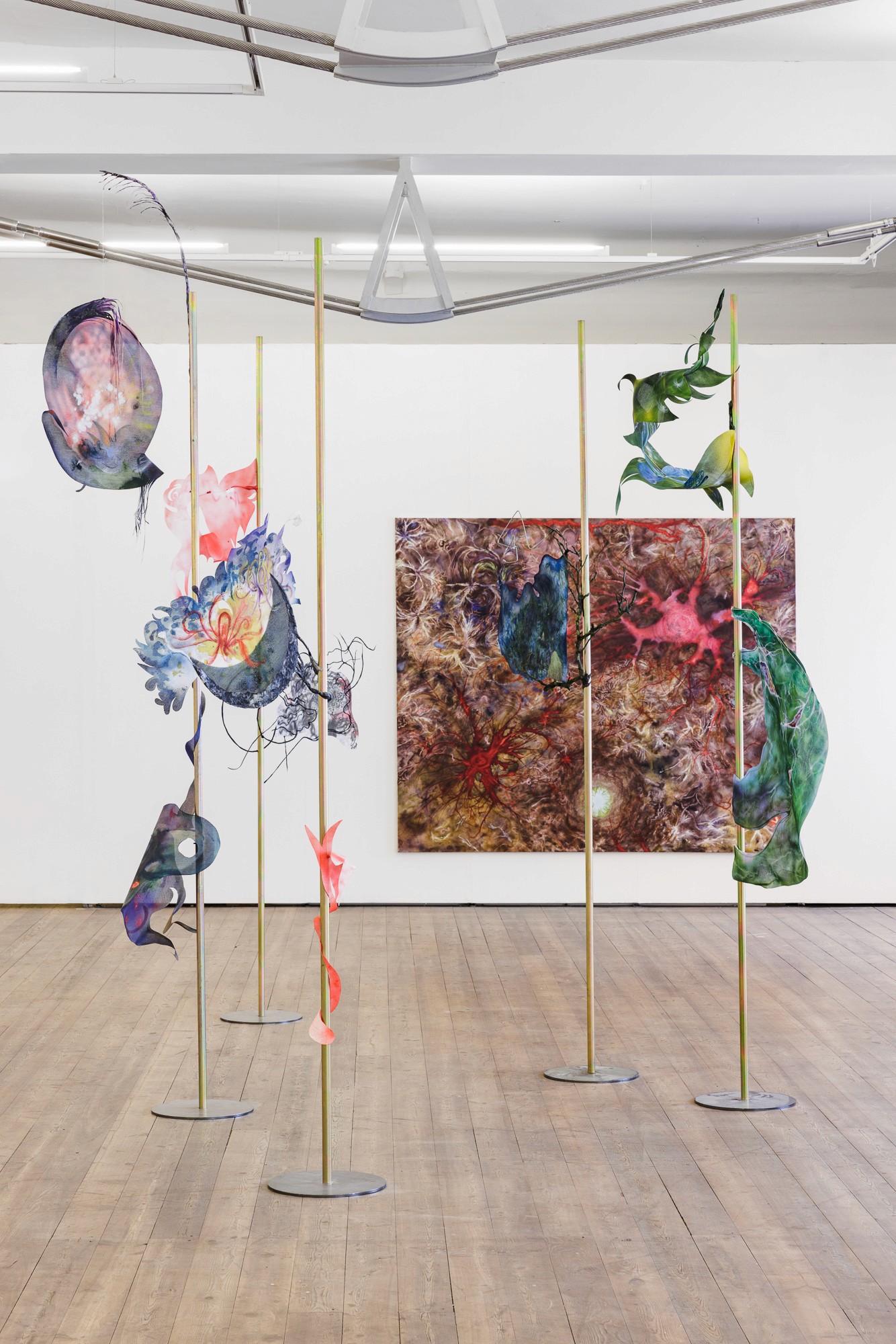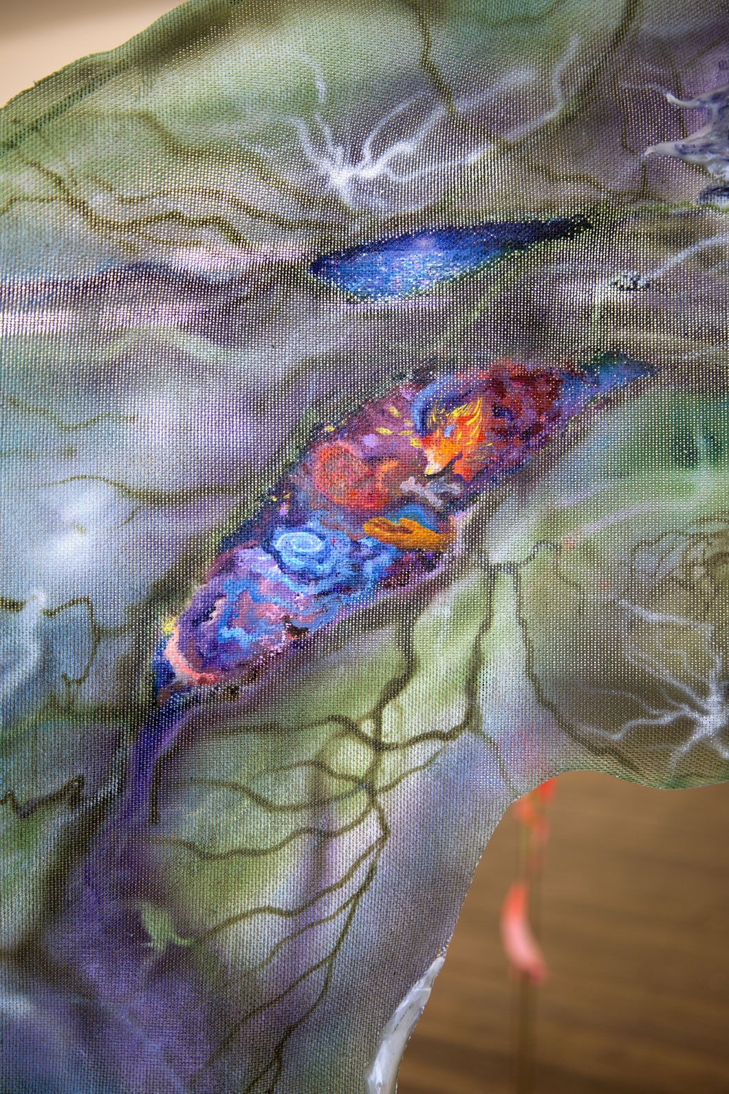 The Eye of the Shoal, ink, acrylic, oil, nail polish, polymorph, woven paper, magnets, 54 x 86 cm, 2020