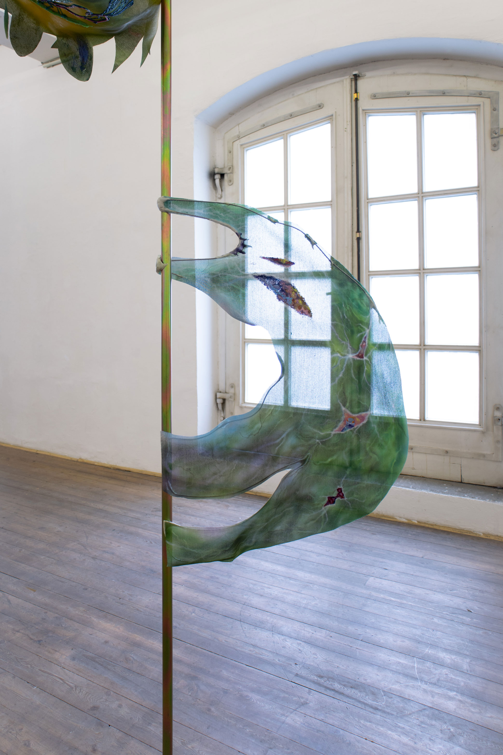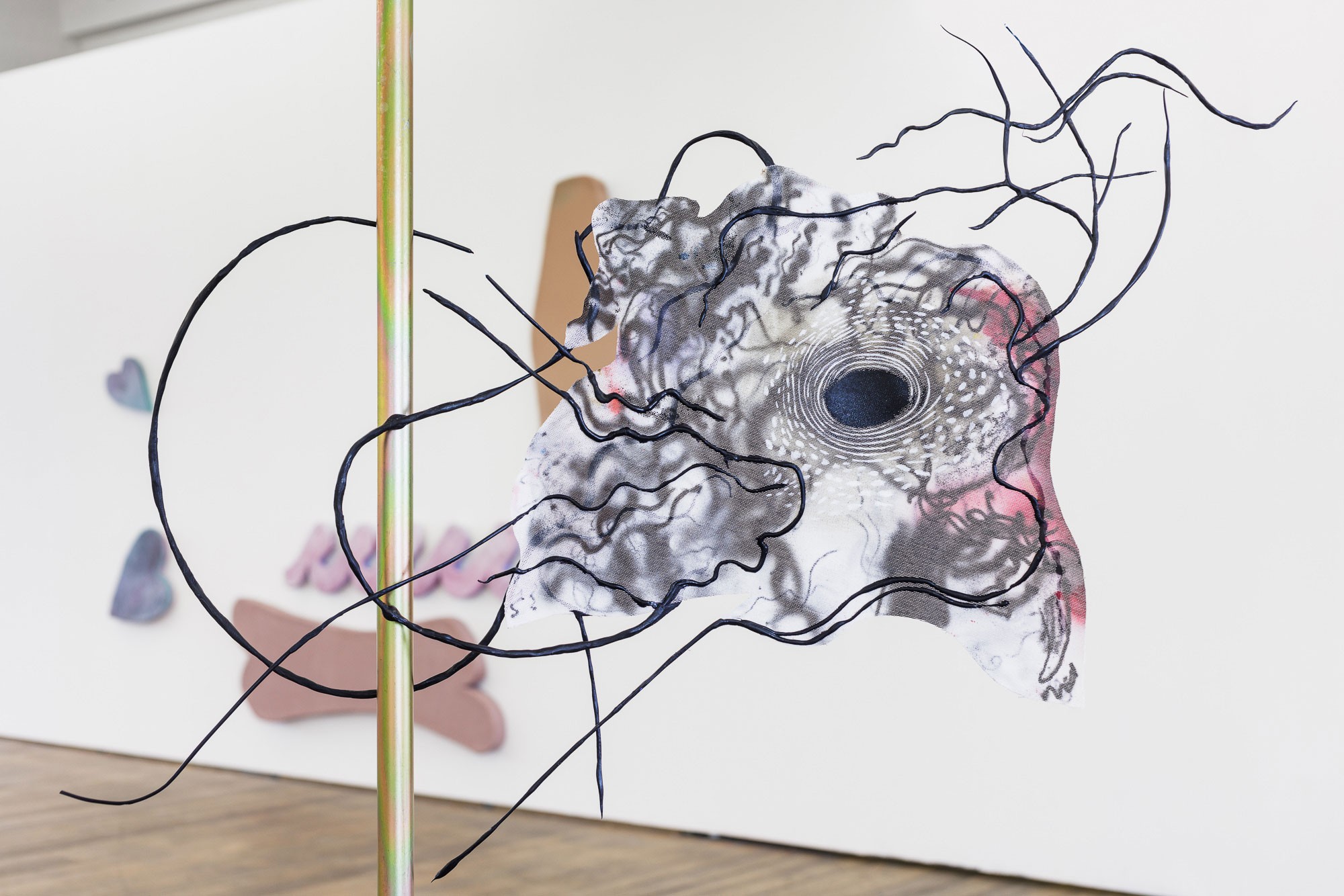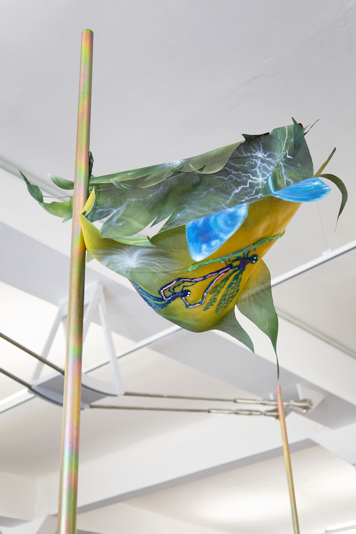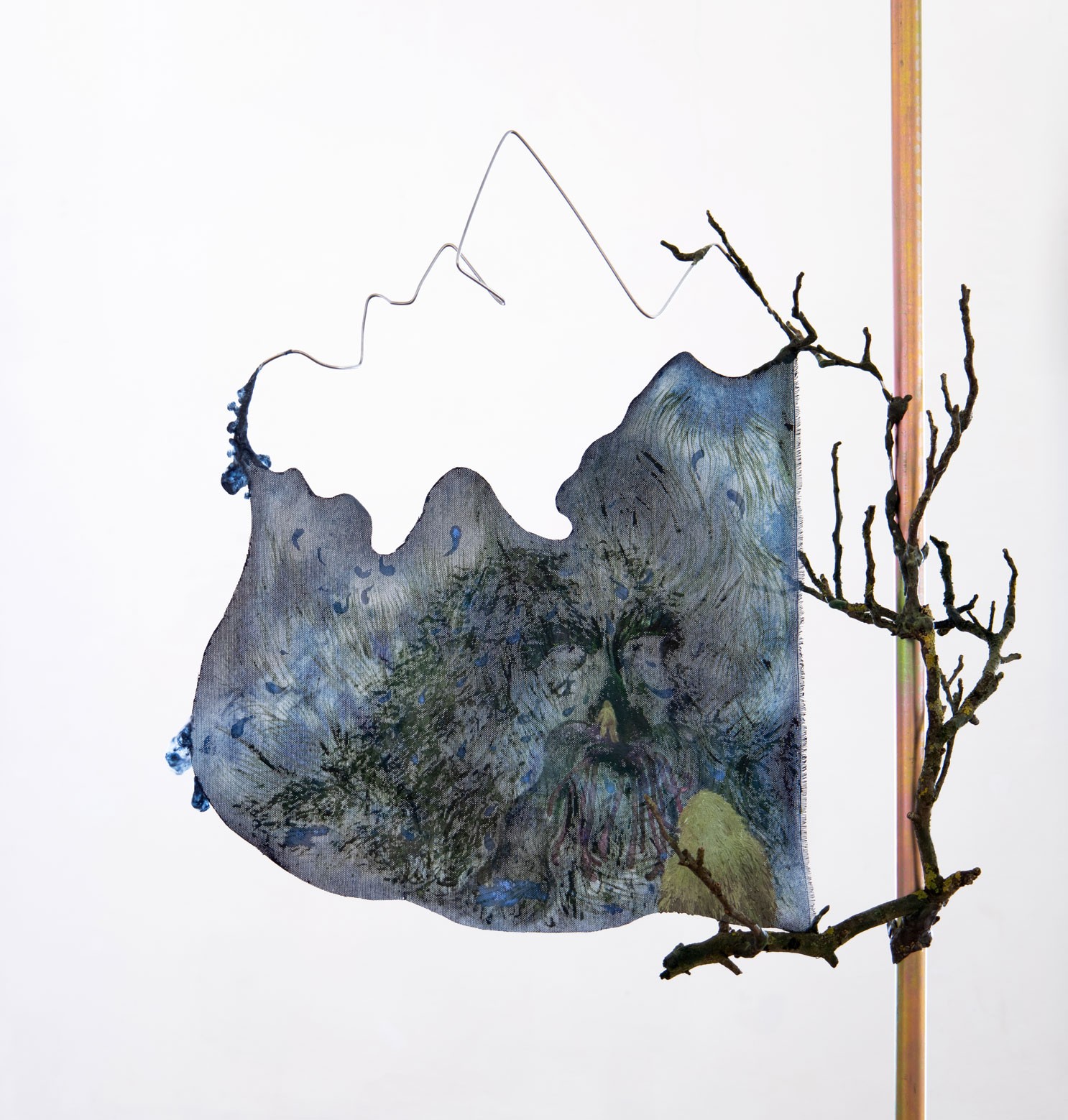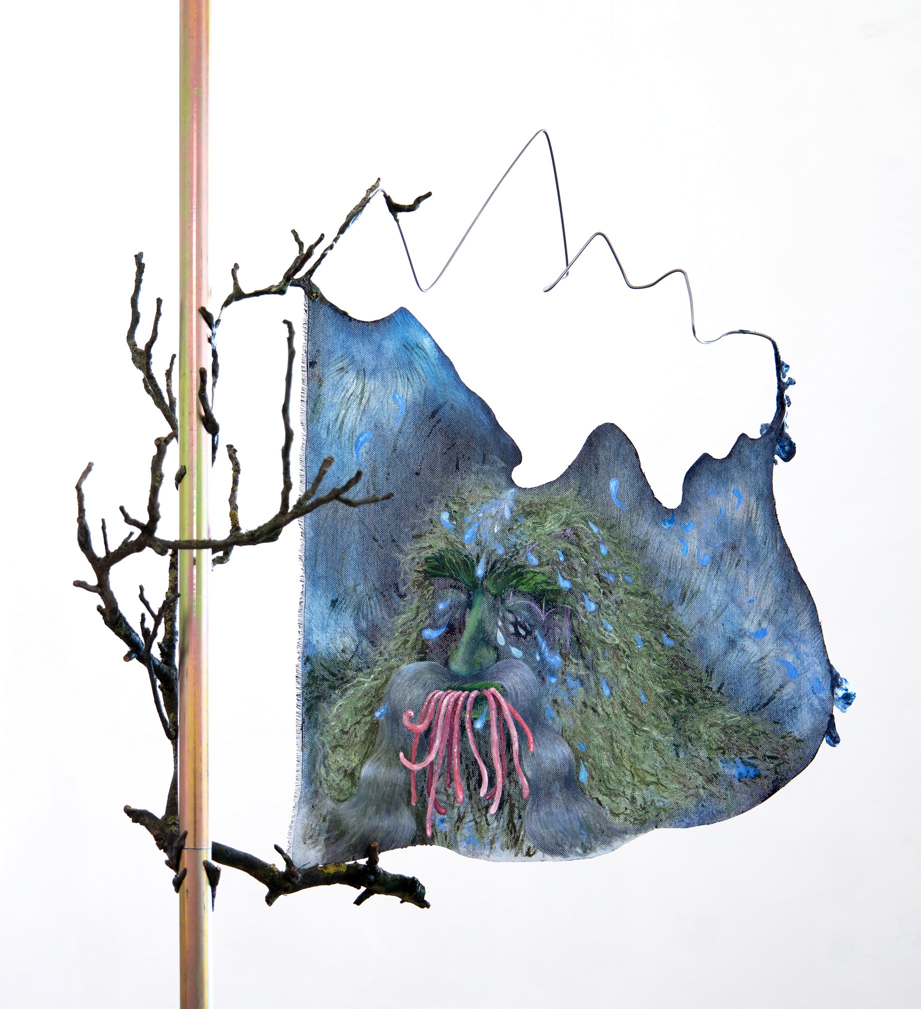 Love on Dandelion, ink, acrylic, oil, nail polis, polymorph, hot glue, woven paper, steel, magnets, 99 x 50 x 36 cm, 2022