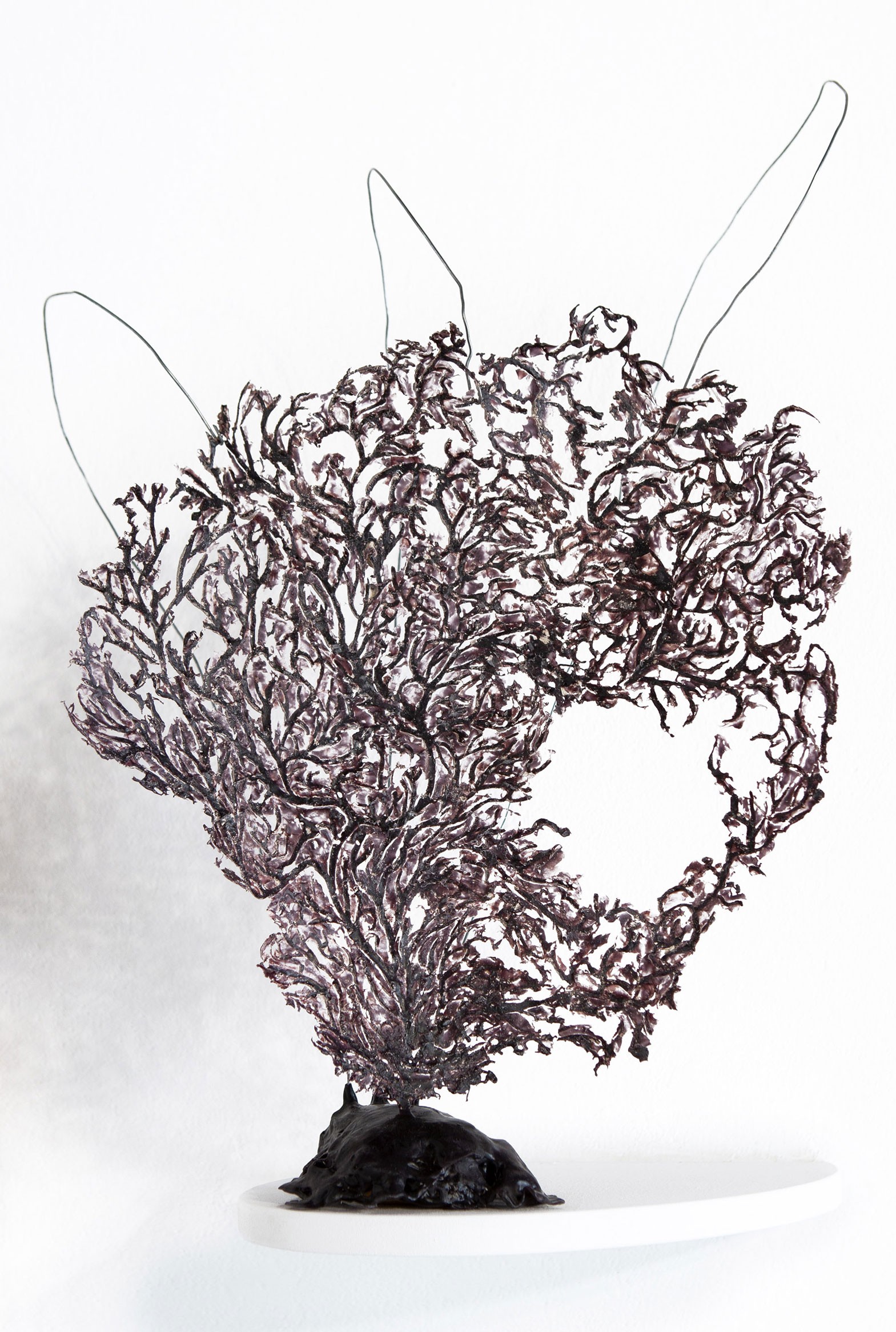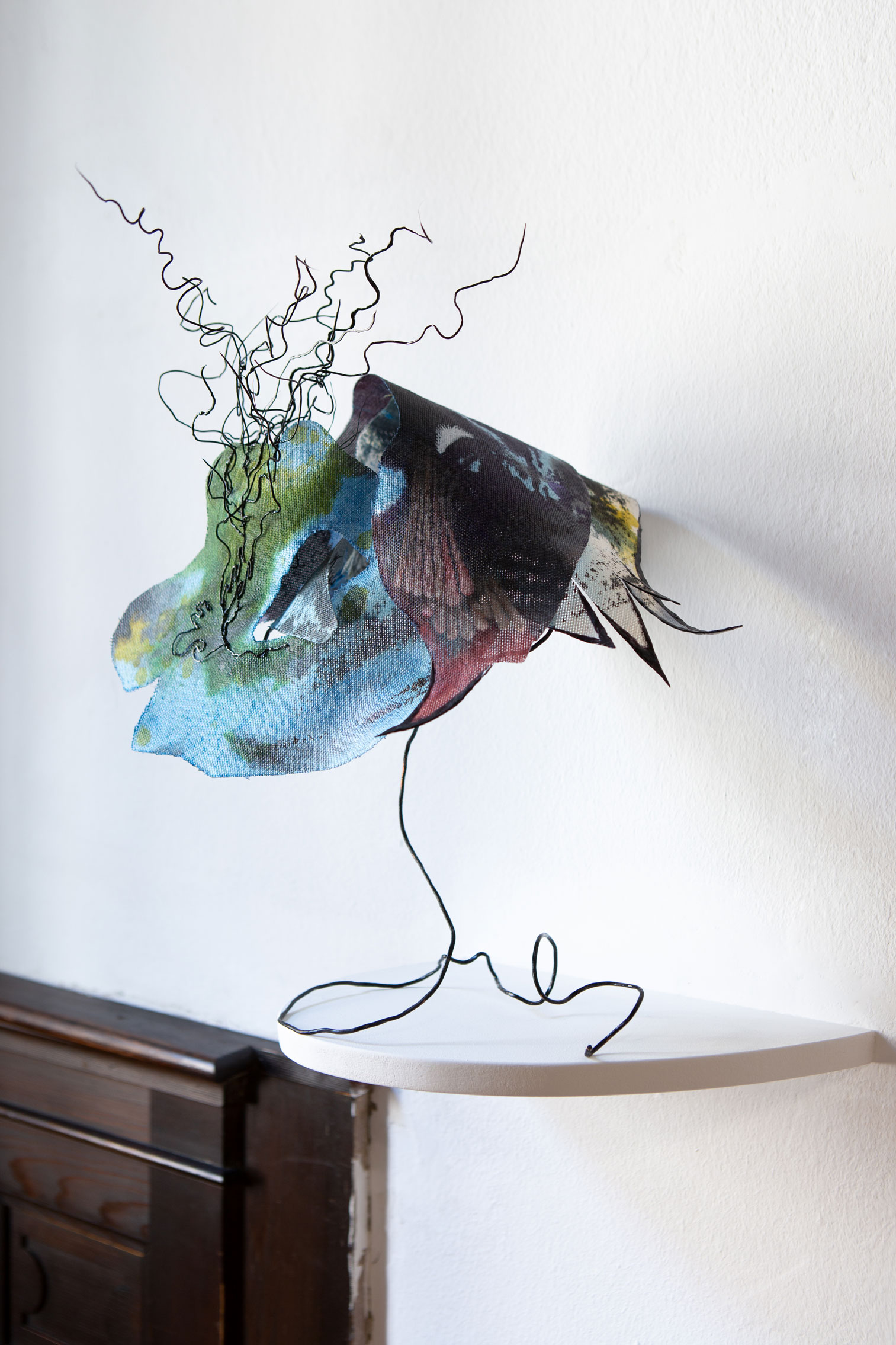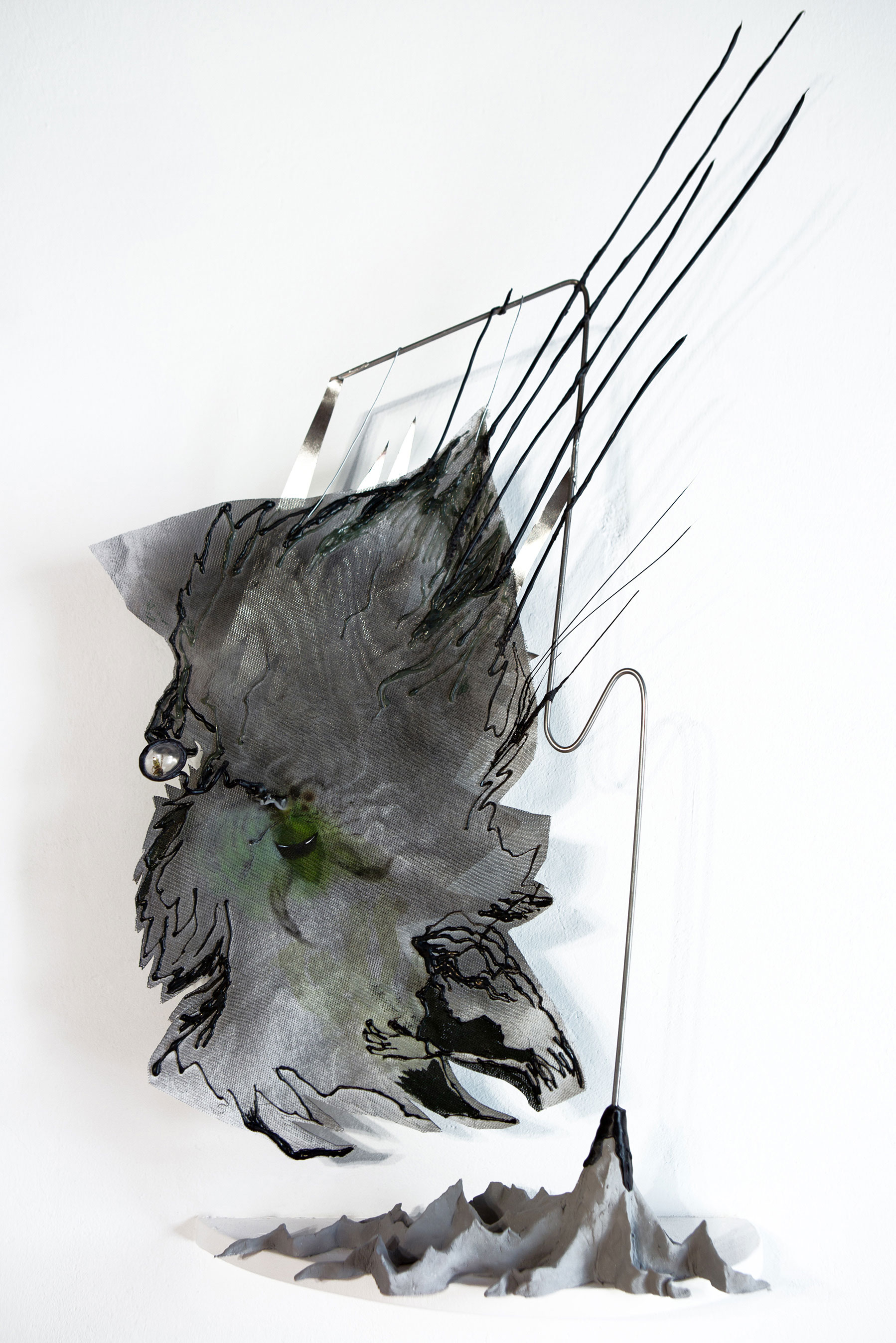 getting mad around the head, 38 x 32 x 35 cm, ink, oil, PLA, acrylic, woven paper, wire, 2020
