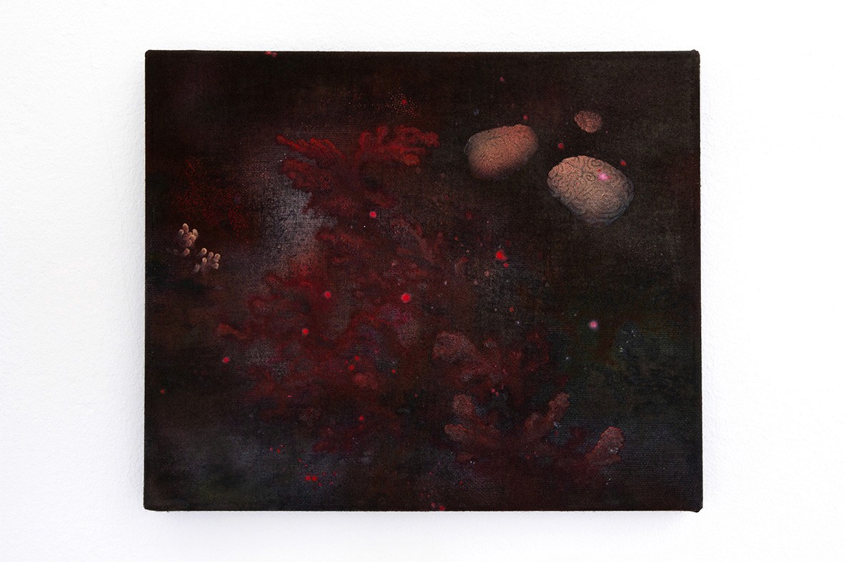 sunken brains growing at the sea ground, 24 x 29 cm, oil, laquer, ink on cotton, 2020
