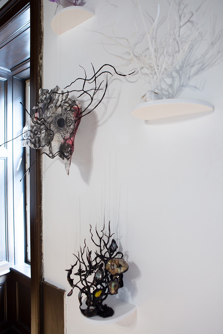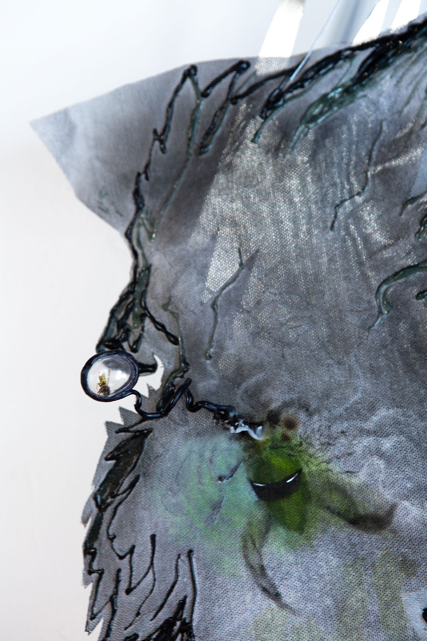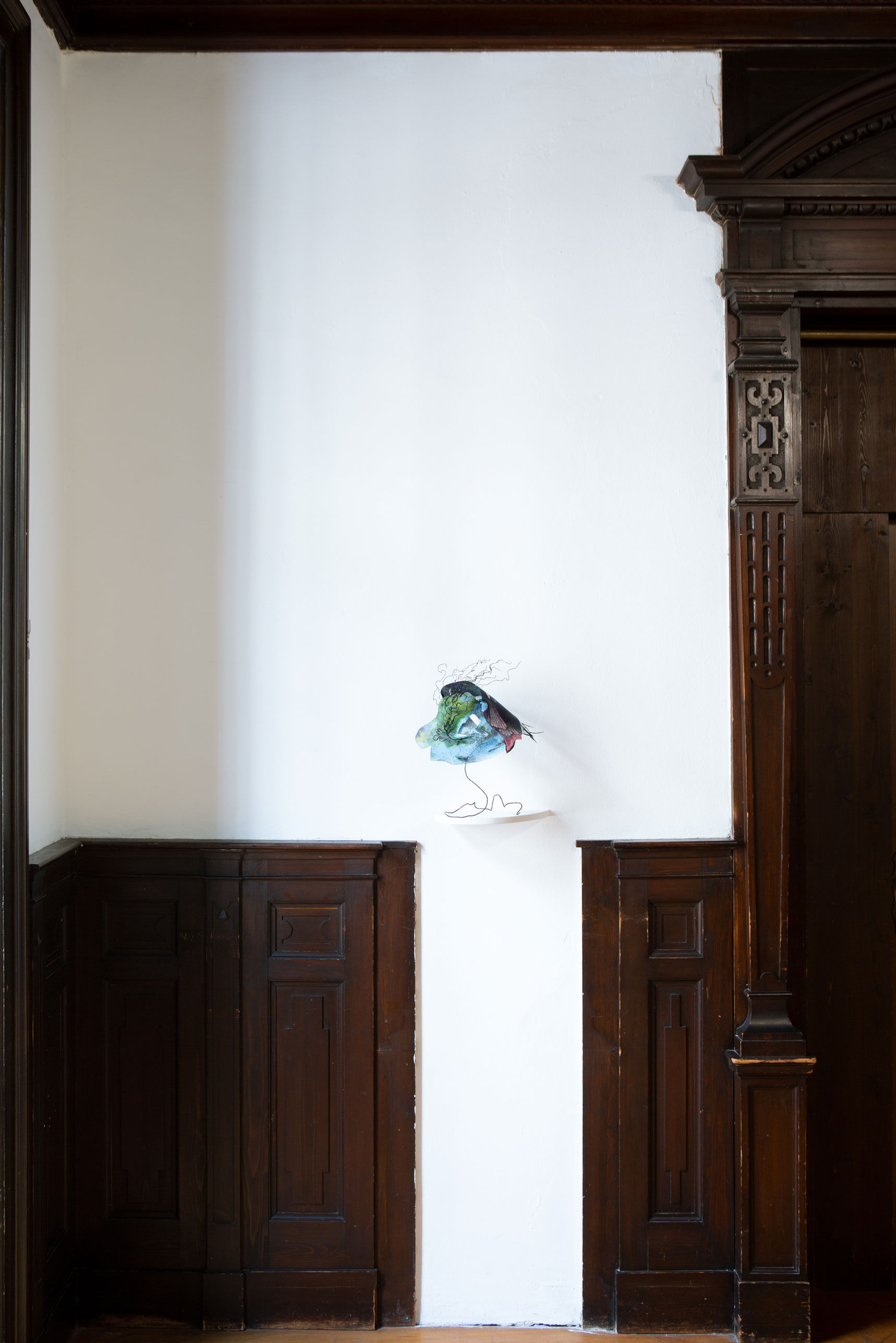 in usual emergency mode, 48 x 52 x 14 cm, woven paper, oil, ink, polymorph, PLA, glue, metal, modelling clay, wasp, 2020