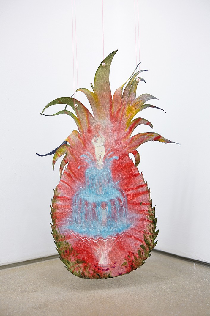 Ananas, ink, acrylic, oil, nail polish, polymorph, woven paper, strings, magnets, 50 x 32 cm, 2019