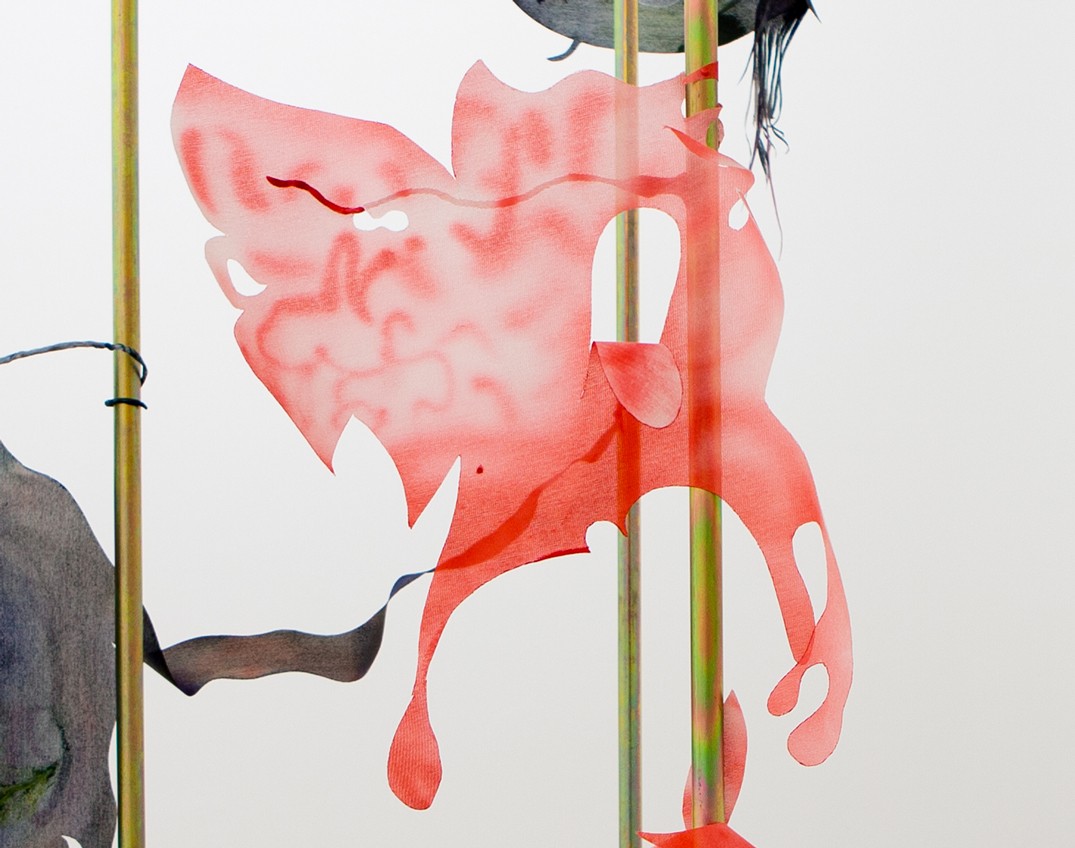 P, ink, acrylic, nail polish, polymorph, woven paper, (two parts), steel, magnets, 60 x 50 cm, 2019