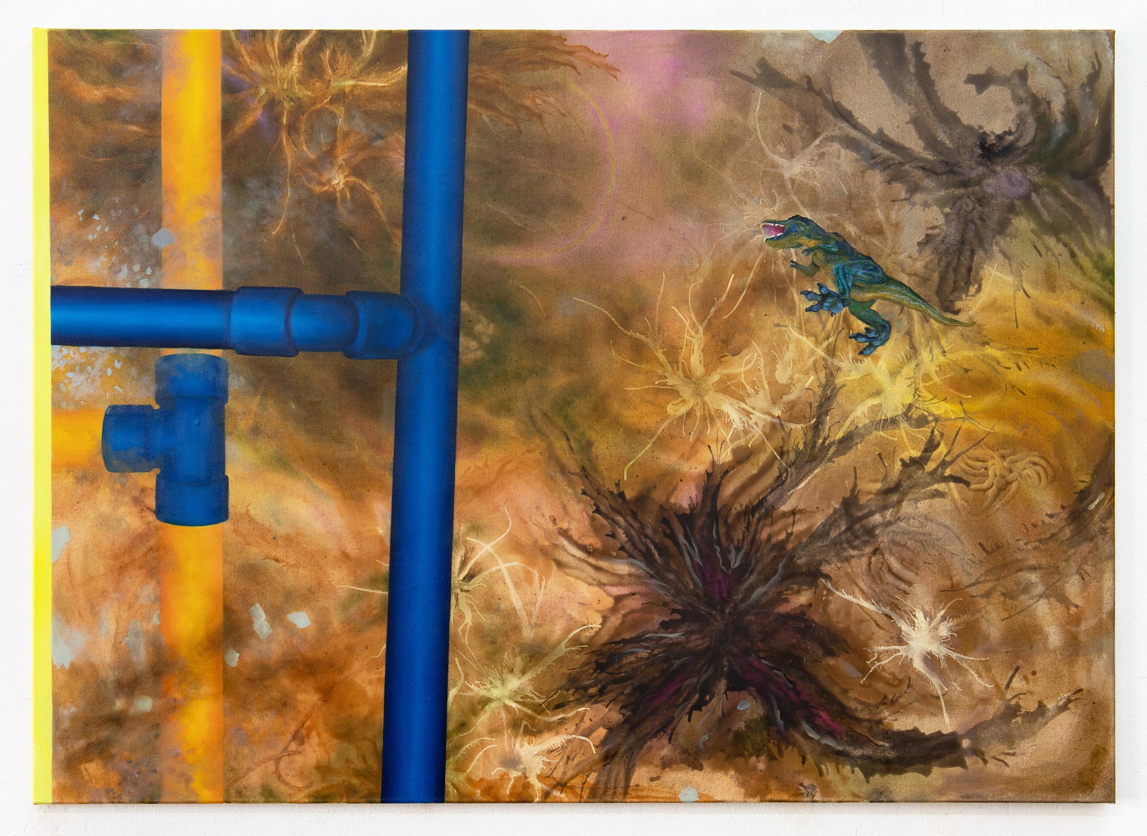 Close (Roots and Branches) ist eine Arbeit der Serie Close, die in Auseinandersetzung mit dem Wald entstand und ebendort ein Jahr lang stand bzw. ausgestellt war. Tür und Vorhang sind malereihistorisch Motive, das Selbstverständnis des Mediums zu verhandeln und mit dem Un- Sichtbaren umzugehen. So stand Close (Roots and Branches) wie ein Portal in eine andere Dimension inmitten einer Lichtung und verweist gleichzeitig auf „Natur“ als gestalteten Raum. Bezugnehmend auf Verziehrungen von Türen Tiroler Stuben, hat der Rahmen eine skulpturale Zierleiste aus in der Umgebung gefundenen Objekten. So können weitere Facetten ihrer Bedeutung wahrgenommen mit Alien-Siebenschläfer entgegen. Auf der anderen Seite des Vorhangs sieht man eine verschneite Landschaft, die die Wurzeln aus geronnener Farbe darunter erahnen lässt. Während der Winterzeit sah es tatsächlich wie ein Durchsichtigkeits-Schleier aus. Gleichzeitig duftet es von unten her schon nach Myzelium des Herbsts („autumn aroma“). Das Format ist einem Smartphone ähnlich, dessen Sprünge sich mit den Wurzeln überlagen. Eine weiterer Bildschirm spiegelt den Blick der Spaziergängerin. Der Rand der Malerei besteht aus unbemaltem Leinen, das von der Natur weiter bearbeitet wurde auch die durch Wettereinflüsse entstandenen Sprünge in der Malerei verfeinenrn zum Beispiel die Rinde oder Sprüng im Screen.